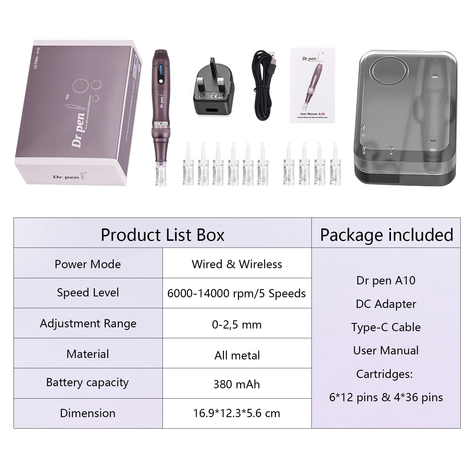 Dr.Pen A10: The surface of the microneedling pen adopts the popular purple color, which is comfortable to touch and not easy to slip. The pen is equipped with 10 pieces cartridges for you to use to meet your various needs.